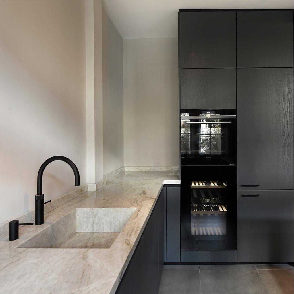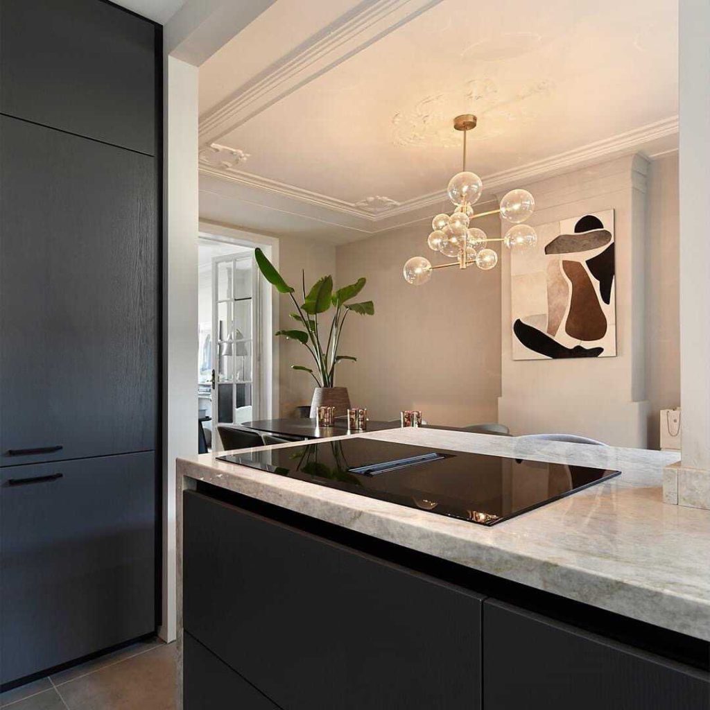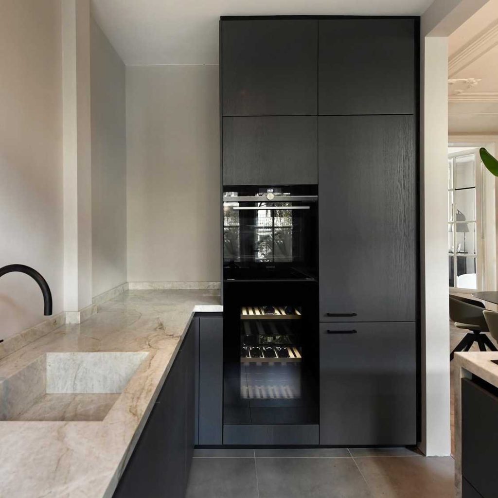 Aan de Keizersgracht kreeg deze woning een moderne en chique uitstraling, zonder het karakter van het grachtenpand te verliezen. Het ontwerp brengt de historische elementen subtiel samen met een strakke, eigentijdse vormgeving. Door het gebruik van marmer, verfijnde sierlijsten en rustige, strakke lijnen ontstaat een interieur dat zowel luxe als tijdloos aanvoelt.