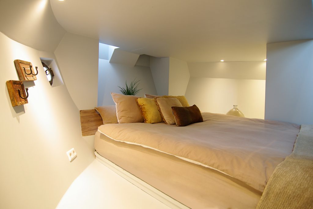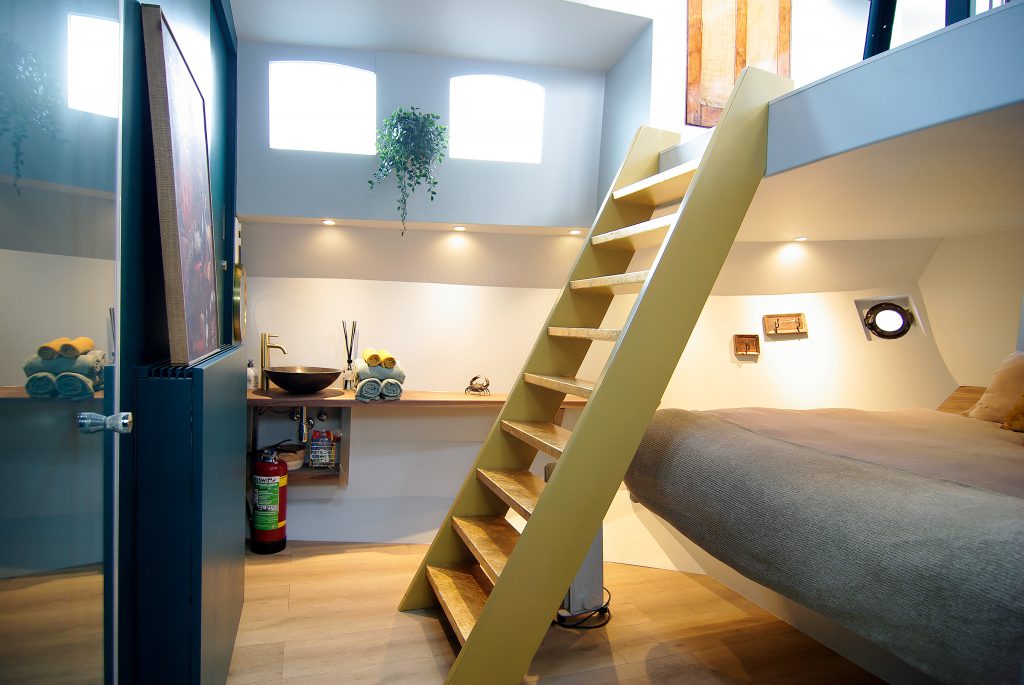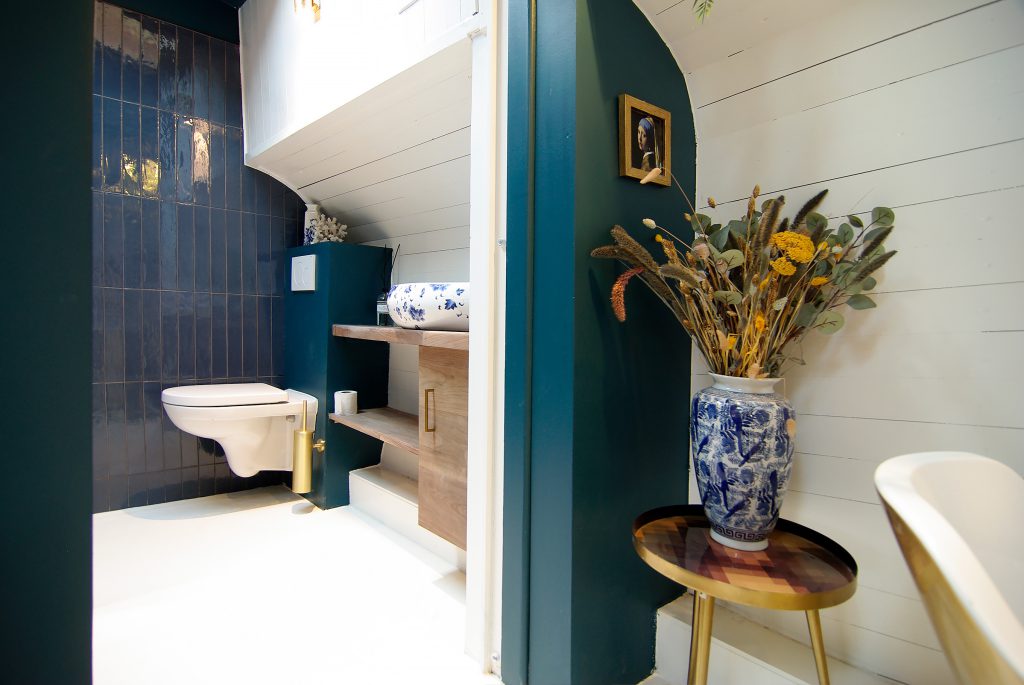 Voor deze bijzondere woonboot in de havens van Amsterdam ontwikkelde ik een boutique B&B-concept geïnspireerd op de Gouden Eeuw. Een thema dat logisch aansluit bij de historie van de locatie en zorgt voor een luxe, warme basis in het interieur. Het gebruik van goud fungeert hierbij als een krachtig statement: van het vrijstaande gouden bad dat direct de aandacht trekt tot de met bladgoud beklede trap die de entree een unieke, hoogwaardige uitstraling geeft. Deze elementen versterken elkaar en maken de B&B direct herkenbaar, onderscheidend en volledig passend bij het karakter van de woonboot.